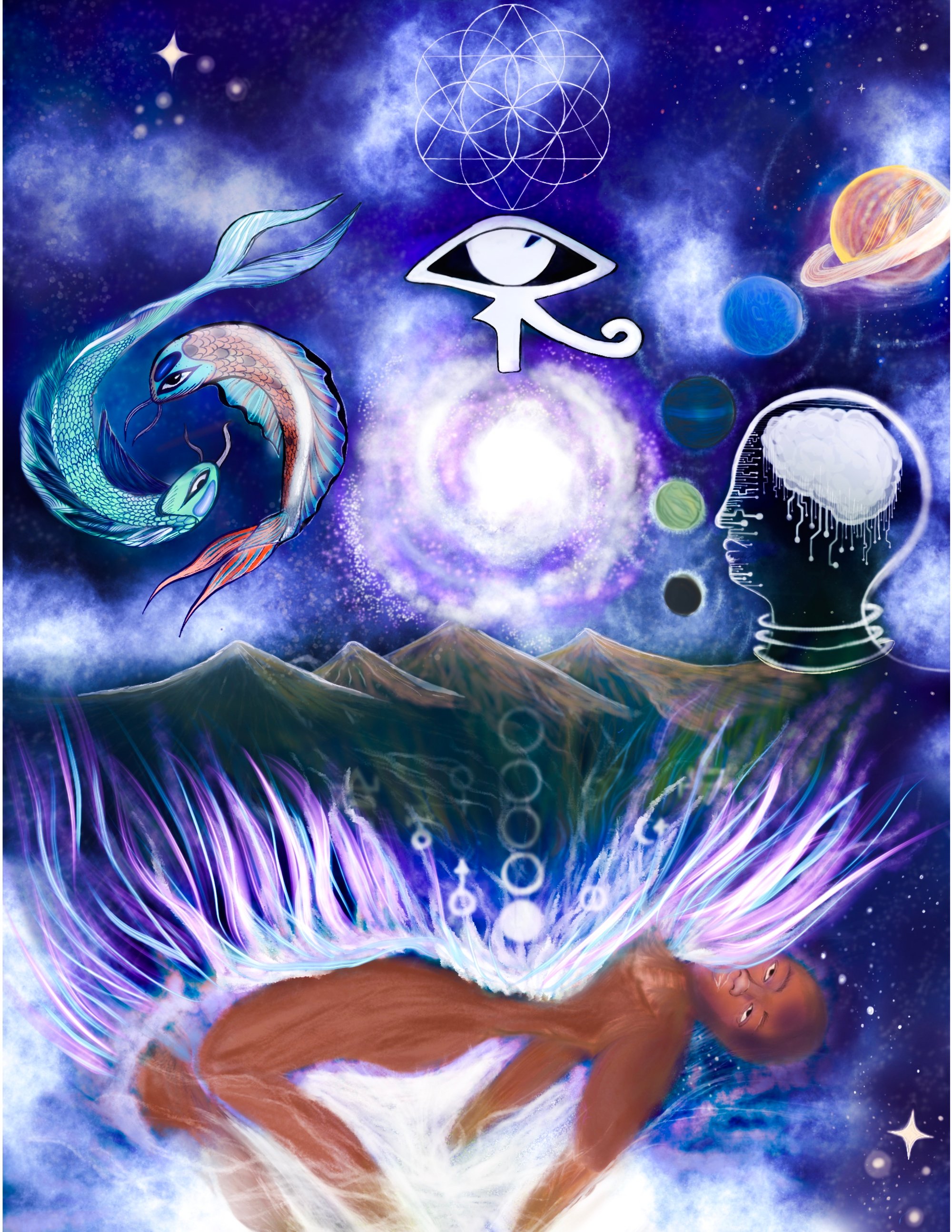 This is a digital version of my very first oil painting. The meaning behind this piece of art has evolved and changed with me over the years, but it stems from a story of someones spiritual awakening that was communicated to me by a close friend. We were on a flight back from a very influential trip. The experience that was had was explained to me as what I understand my connection with the universe to be, and that is an interwoven connection to every living being & particle on earth. It's very difficult to explain something so complex, yet simple. Our consciousness is like a web that stretches beyond our eyes, the earth flows in synch with every movement we take. She also feels the heat of our neglect, and our bodies and souls feel it too. Everything we put out, we get returned. As above, so below.